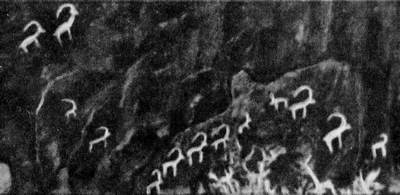 Везде на скалах рисунки! И там и тут целая картинная галерея! Больше всего выбито в скалах козлов: рогатых, бородатых, важных. А вот бараны-архары с толстыми, круто закрученными рогами. Олени-маралы значит, и они когда-то тут жили.