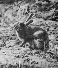 Но вот запись, которую перевести тоже просто, а вот понять трудно. «Нору в снегу копал до самой земли». Всё верно: снег, в снегу нора до земли. И не малая глубже метра. На дне мох мороженый надран, «шишка» рогоза растрёпанная. Может, заяц по зелени истосковался? Да нет, не похоже: ни мох, ни «шишка» не тронуты только растрёпаны и брошены. Зачем же тогда заяц нору копал? Спать беляк в норе не ложится и от ветра в норы не прячется. Да и по следам видно: нору выкопал, «шишку» рогозовую растрепал да и поковылял дальше.