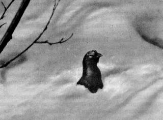 Тетеревиная спальня это две норки в снегу: вход и выход. С выходом всё ясно. Выспавшись под снегом, тетерев утром высунет из-под снега голову, оглядится и взовьётся свечой. По краям лунки оставит два мазка крыльев. Когда особенно тихо, просто из снега вылезет и пошагает. А если тревога, то и не высовывается даже, а сразу взлетает, вздымая снежный фонтан. Это тоже всё по следам видно, и загадки тут никакой нет.