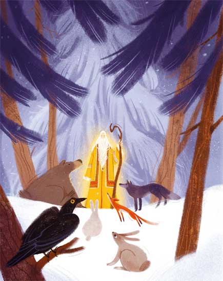 Позвал Торум таёжных зверей к поваленной берёзе. Подбежали к нему олень, волк, лиса, выдра, заяц, барсук, бурундук и медведь. Навострили уши, принюхиваются, с лапы на лапу переминаются.
