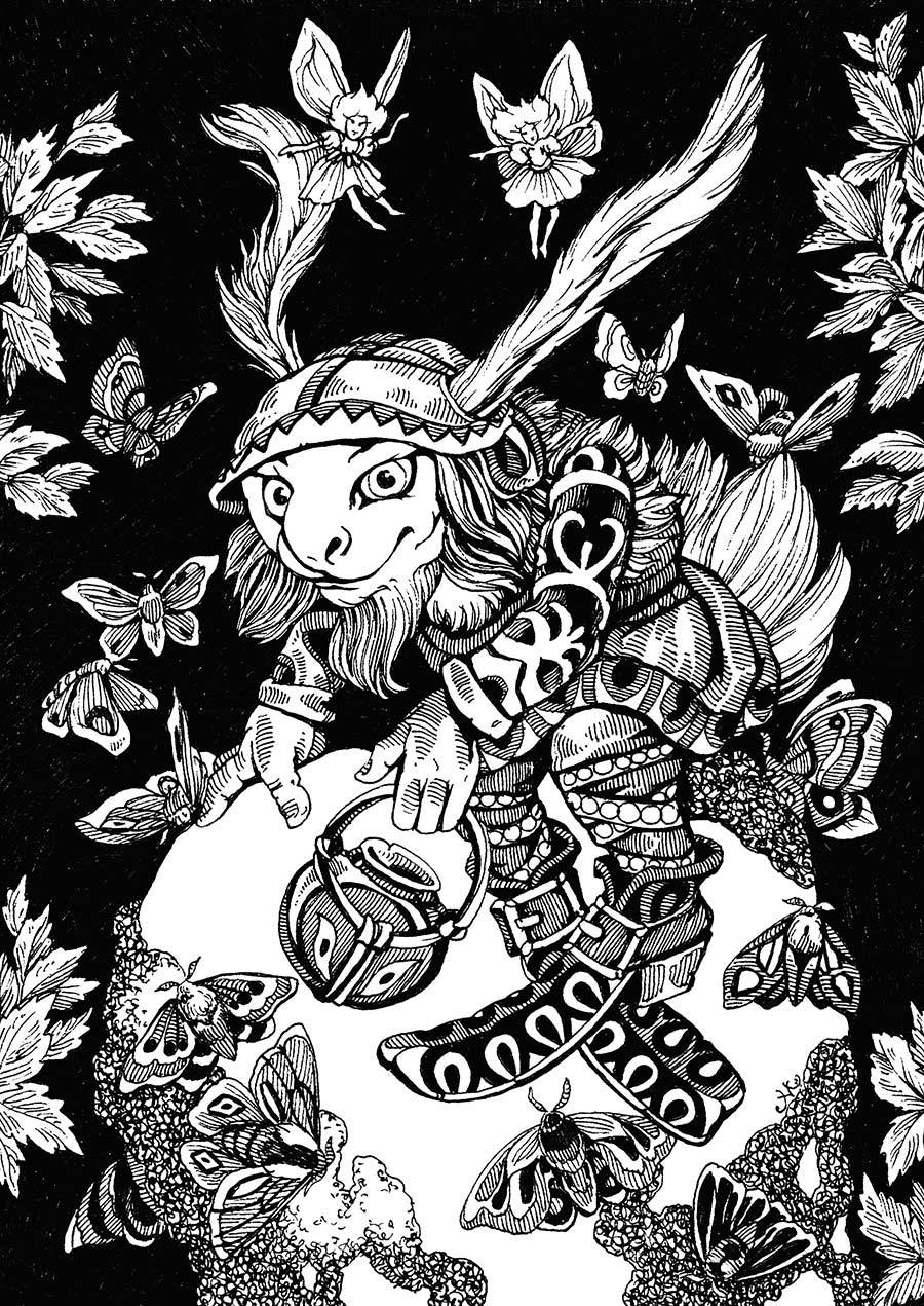 Существо напоминало зайца только ушами длинные, нервные, они постоянно шевелились, улавливая посторонние звуки, да немного мордочкой, которая, как и уши, была постоянно в движении. Казалось, что волшебное создание строит нам рожи. В остальном «заяц» походил на гнома. Одет он был в меховой костюмчик, сшитый, скорее всего, из шкурок зайцев. И этот костюмчик, и кожа «зайца» были красными. Существо смотрело на нас ярко-синими глазами, в которых не было и тени испуга. И совсем не думало убегать.