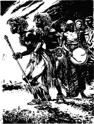 Двое плясали вокруг костра. Спутанные курчавые волосы торчали у танцоров в разные стороны, короткие юбочки из сухих пальмовых листьев развевались вокруг бедер. Жрецы до самого пояса были голыми, только длинные бусы свисали с их плеч, перекрещиваясь на груди, и такие же бусы подпрыгивали у них на лодыжках. Они плясали, размахивая короткими опахалами из тростника, и потные тела блестели в свете костра.