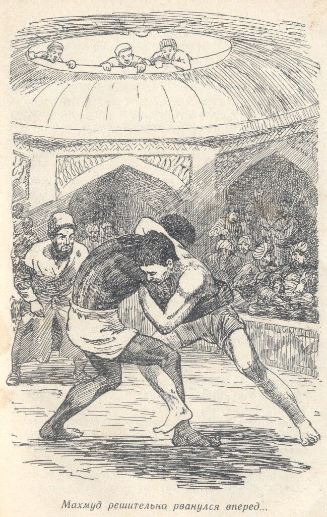Одноглазый был в полтора раза тяжелее Махмуда. Начинать борьбу за победу он решил с запрещенного приема. Перс долго отступал, норовя ухватить Махмуда за руку, и вот, выбрав удобный момент, рванулся вперед. Махмуд разгадал замысел врага. Он отскочил и, пока противник не оправился от промаха, вошел в ближнюю стойку. Так было безопаснее. Тогда перс решил применить кружение. Без особого труда он оторвал Махмуда от земли и закрутился с ним все быстрее и быстрее. Тела атлетов мелькали перед зрителями, а потом слились в один сплошной клубок.
