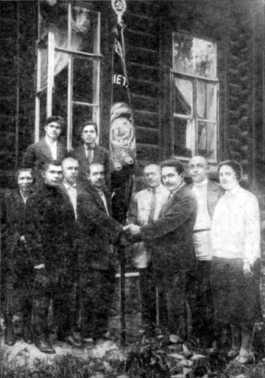 Представитель Компартии Франции вручает Кулебакскому центральному рабочему кооперативу Красное знамя. 1928 год