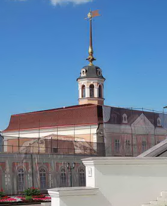 2 сентября 1836 года Николай I также распорядился, чтобы отремонтировали ветхую Введенскую церковь XVIII века и соединили переходом с новым дворцом. В 18521859 годах церковь переименовали и заново освятили в качестве домового храма во имя Сошествия Святого Духа. В годы власти большевиков крест с крыши церкви убрали, а в храме организовали столовую. Автор неоднократно обедал в ней. После прихода к власти президента Шаймиева и энергичного строительства мечети, современной реконструкции ханских могил и водружения полумесяца на соседнюю русскую сторожевую башню, крест на церковь не вернули.
