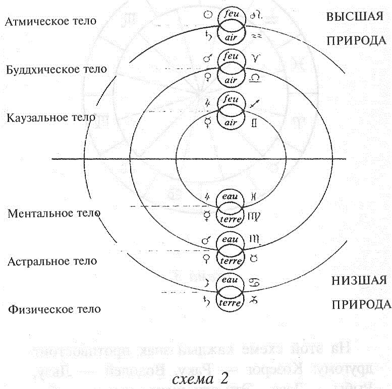 Как вы уже знаете, каждое тело обладает своим двойником. Двойником физического является эфирное тело, которое оживляет его и наделяет чувствительностью; то же самое относится и к другим телам, поэтому схему можно дополнить, обозначив каждое тело и его двойник двумя кружками, также указав зодиакальное созвездие и планеты, которые им соответствуют. (Более подробные объяснения этой схемы смотри: Полном собрании сочинений, том 2, глава «Если вы не умрёте, вы не воскреснете».)