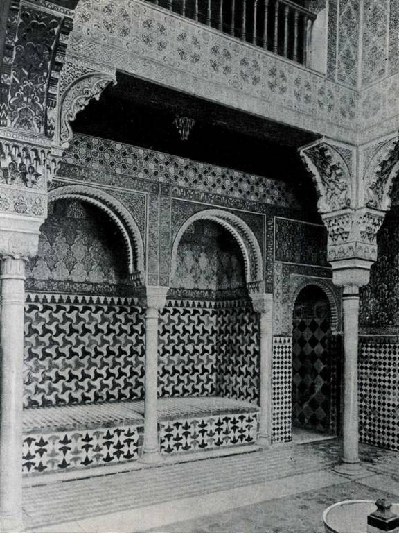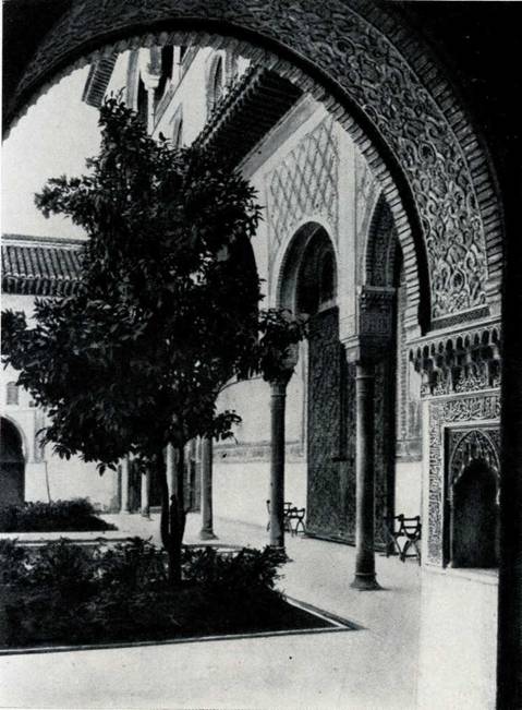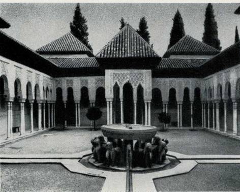 воздействия архитектуры Львиного двора без яркого солнечного освещения. Кроме того, в Львином дворе значительнее роль деталей и отдельных частей по сравнению с Двором мирт. Поэтическая красота Львиного двора воспета в стихах поэта-везиря Ибн Зумрука (ум. 1393). Львиный двор ритмически объединен с соседним залом архитектурной формой сталактитами, которые стали основным элементом оформления Зала правосудия, иначе Трибунала, или Королевского зала, примыкающего ко двору с восточной стороны. Зал имеет форму коридора с чередующимися сталактитовыми арками. Парными арками зал делится на семь частей, три из которых открыты в Львиный двор. Над залом возведены три небольших купола, потолок сделан из дерева кедра. Всюду сверкает позолота. Свет проникает в зал с трех сторон, но своды его остаются затененными. В нише на потолке помещены три композиции, выполненные на коже. Скорее всего, это работа мастеров XIX, а не XV века, как предполагали раньше. В этом зале во время торжественной мессы по поводу взятия Гранады присутствовал Колумб. С южной стороны ко Двору львов примыкает Зал Абенсеррахов. Это название дала залу знатная гранадская семья, соперничавшая с другой, не менее знатной. Легенда говорит о том, что однажды кто-то из семьи Абенсеррахов победил своих противников во время турнира на площади Виваррамбла. Тогда побежденные соперники обвинили одного из членов семьи Абенсеррахов в связи с королевой, женой Боабдила. Боабдил, желая отомстить, созвал всех Абенсеррахов на пир в Альгамбру, где во время праздника вся семья была обезглавлена в зале, получившем с тех пор их имя. Связанный с драматической легендой зал прекрасен по своей архитектуре. Прямоугольный в плане, он имеет в центре еще и квадратное пространство, образованное изящными арками, опирающимися на тонкие стройные колонны. Зал этот был значительно разрушен, но затем восстановлен под руководством архитектора Берругете. Сталактиты, гроздьями свисающие вниз, образуют вверху зала сложную форму. Таким образом, «тема сталактитов» объединяет три помещения. С противоположной от Зала Абенсеррахов стороны к Львиному двору примыкает одно из самых прекрасных по своей архитектуре помещений Зал двух сестер. В него ведут три мраморные ступени. Название зала связано с его архитектурой в пол вделаны две мраморные плиты. Зал подлинный шедевр, покоряющий красотой и тонкостью резьбы и орнамента, а также звучностью цвета изразцов. По стенам идут куфические надписи, органично вплетающиеся в орнаментальную вязь. Зал разделен на три части, в центре его выделен квадрат, перекрытый куполом; боковые помещения были, видимо, спальнями с характерными для всей Альгамбры окнами с двойными арками и тонкой колонкой посредине. Самая поразительная часть зала его купол. Он кажется совершенно фантастическим, с какой-то причудливой поверхностью благодаря сталактитам. Купол составлен из сотен маленьких частей ячеек, скорее всего, его можно уподобить огромному цветку, вознесенному над центральной частью зала. На высоте восьми метров от пола в центральной части зала устроены своеобразные выступынавесы со спускающейся с них причудливой бахромой сталактитов.
