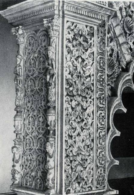 отсутствует так часто применяемый в Альгамбре мотив сталактитов, хотя и в том и в другом памятнике встречаются общие орнаментальные мотивы. Алькасар решен проще и, пожалуй, камернее. Несмотря на орнаментальный убор, покрывающий стены всех залов, в нем нет логики переходов и особого пространственно-плоскостного развития орнамента. Кроме того, сталактиты и резной орнамент Альгамбры создавали какую-то особую светотеневую и пространственную среду внутренних помещений, их таинственно-сказочную атмосферу. Плоскостно-декоративное, почти лишенное светотеневой игры решение стен в Алькасаре, где орнаментальный узор включается в четкие геометрические фигуры наподобие больших плит, кажется упрощенным, а камерность неожиданно сочетается с некоторой холодностью.