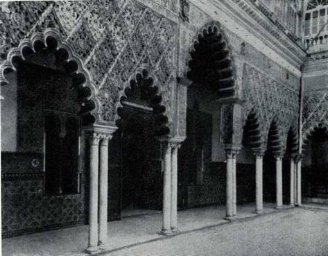 К XIV веку относится основное строительство Алькасара. К этому же времени было отнесено Тирсо де Молиной и действие сцены его пьесы о Дон Хуане, где II акт начинается в Алькасаре. Но большинство легенд связано в нем с именем Педро Жестокого (13491368). Одно из преданий рассказывает о выборе им судьи, когда на одно место было четыре претендента. Король сорвал ветку с апельсином, разрезал плод пополам и бросил ветвь в воду таким образом, что сверху было нельзя определить целый апельсин или он разрезан. После этого король обратился к каждому из претендентов с вопросом: что это? Первые трое немедленно ответили, что это апельсин, а четвертый вынул ветвь из воды и только потом ответил, за что и получил место судьи, а первые трое были изгнаны. Познакомившись с комплексом Алькасара в Севилье, его невольно приходится сравнивать с Альгамброй в Гранаде. Это сравнение возникает из-за архитектуры внутренних дворов, так как в них на первый взгляд применено сходное орнаментальное оформление стен, система арок и колонн. Но впечатление создается иное. Из всего сложного взаимодействия пространства, светотени и декоративных элементов Альгамбры здесь, в Алькасаре, остается лишь плоскостно-декоративное начало. Исчезает причудливая поэзия гранадского замка, уступая место нарядной праздничности. Почти
