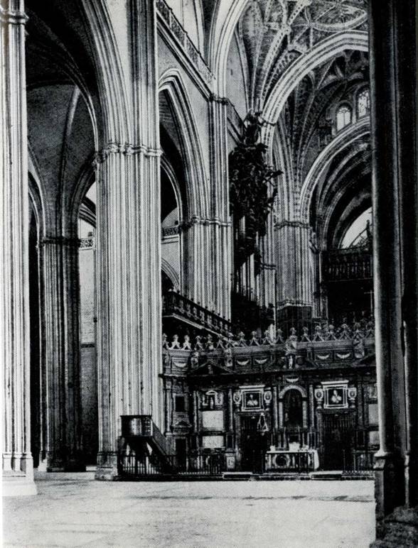 В отличие от многих современников Монтаньес старался избегать экзальтации образа. Не меньшей известностью, чем «Христос милосердия», пользуется и его другая скульптура «Непорочное зачатие», или «Маленькая слепая», как ее называют в Севилье. Скульптура юной Марии помещена в маленькой капелле, получившей название по имени статуи. Трогательная юная Мария изображена Монтаньесом с опущенными глазами, что и послужило причиной для наименования статуи. Среди картин в сакристии выделяется полотно Гойи «Святая Юста и святая Руфина», написанное в 1817 году. Святые Юста и Руфина были очень популярны в Севилье как местные святые, покровительницы города. Их изображения встречаются неоднократно и в соборе. Согласно легенде, они были дочерьми севильского гончара и замучены в 300 году за отказ поклоняться Венере. Обычно юных святых изображают с определенными атрибутами пальмовой ветвью и глиняными сосудами. Гойя представил их на фоне Хиральды, символизирующей город. Композиция картин и в какой-то степени типы лиц имеют сходство с произведением Мурильо на тот же сюжет (картина Мурильо находится в Севильском музее). Для написания картины Гойя приезжал в Севилью, но вряд ли сам характер заказа и аллегорический сюжет полотна могли его особенно увлечь в тот период. В картине есть отдельные живо написанные места, но в целом ее нельзя признать большой удачей мастера. Рядом с сакристией висит большая картина (высота фигуры 16 метров) художника Матео Переса де Алесио, изображающая св. Христофора, несущего через реку младенца Христа. По поводу этой картины Франсиско Пачеко писал: «Для изображения св. Христофора, которого Алесио написал в этой святой церкви и окончил в 1581 году, он сделал много небольших рисунков. . и картон размера самого произведения, не только в виде контуров, но весьма законченный, с тенями и штриховкой; он был выставлен в большом зале Королевского Алькасара. Это изображение является одной из самых больших фигур, когда- либо известных в Испании, потому что в ней было 30 футов вышины от верхней точки головы до ноги, которая виднелась из воды» [35]. Изображение святого было обязательным для всех испанских соборов, так как обращение к нему считалось чудодейственным спасало от насильственной смерти. Недалеко от стены с изображением св. Христофора помещена гробница Христофора Колумба [36]работы скульптора Артуро Мелида (1891). Справа от стены со св. Христофором расположен вход в Ла Гамбе (Капеллу ноги). Столь необычное название капеллы связано с картиной Луиса де Варгаса «Предки Христа» (1561). На картине изображены Адам и Ева, обращающиеся с молитвой к мадонне. Автор «Св. Христофора» Алесио сказал Варгасу, что одна нога Адама стоит всего его святого. Нога Адама считалась превосходно написанной и вызывала всеобщее восхищение современников. Капелла была названа в ее честь. В свою композицию Варгас ввел портрет заказчика, кантора собора Хуана де Медина. Интересное свидетельство о картине оставил Пачеко. «У Луиса де Варгаса, знаменитого уроженца Севильи, среди многих сделанных им портретов был один портрет кантора на цоколе ретабло Адама и Евы, находящегося в соборе. . У двери, которая выходит на биржу. Здесь обычно кантор становился на молитву, и тогда сбегались мальчики и глядели с удивлением то на картину, то на оригинал» [37]. Луис де Варгас (15021568) р