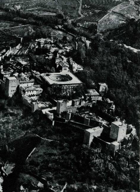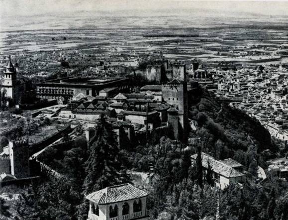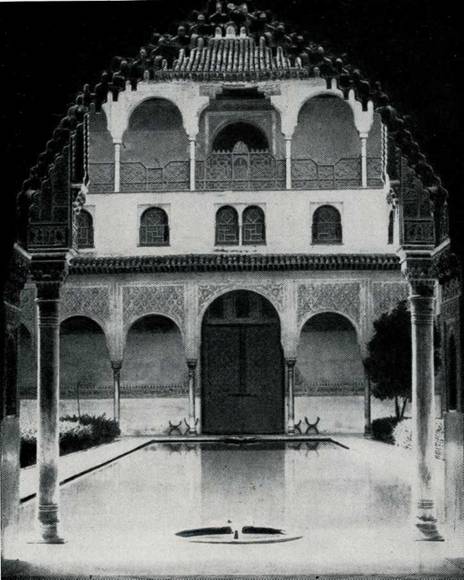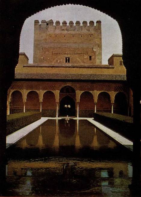 Другой комплекс помещений, где проходила частная жизнь правителей, расположен вокруг Львиного двора, в который можно пройти из Двора мирт через Зал мосарабов [17]вытянутый в длину и узкий (20x4 метра). Зал полностью восстановлен после взрыва в нем в XVI веке пороха. Три прохода в торцовой стене зала ведут в Львиный двор. Строгая гармоническая красота зала здесь сменяется причудливой фантазией. В центре двора находятся двенадцать стилизованных львов, выполненных из черного мрамора, и бассейн из алебастра. Размер двора меньше Двора мирт 28x16 метров, но его маленькое пространство так насыщено различными формами, что кажется богатым, сложным и разнообразным. Основным мотивом здесь являются колонны и подковообразные арки, подобные тем, что применены и во Дворе мирт. Двор выложен мрамором, четыре желоба ведут к бассейну. На восточной и западной сторонах двора сооружены павильоны. Они необходимы не только как оформление входов во двор, но в их решении развивается и усложняется общая архитектурная тема. Они как бы собирают в себе разбег колонн, идущих по боковым сторонам, по одной и по две, а здесь, в павильонах, объединяющихся по три и по четыре. Всего их 124. Оба павильона увенчаны куполами. Ритмический бег колонн гармонирует с ритмом орнамента, покрывающего всю поверхность стен двора. В боковых галереях и в куполах потолок выложен мозаикой из различных пород дерева. В арках павильонов применены для украшения сталактиты. Благодаря такому решению любой новый аспект раскрывает еще не виданную живописную красоту двора.