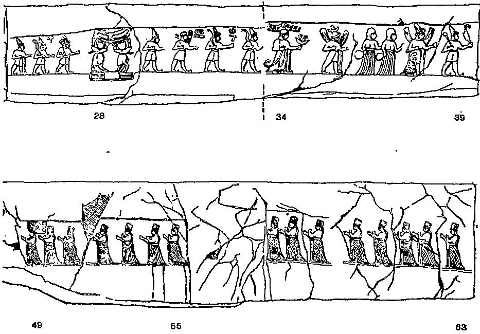 На противоположной стене и тоже как бы в сторону подземного святилища движется процессия из 12 воинов-богов наподобие тех, что изображены на стене внешнего помещения. Они идут стремительно и грозно, подняв серповидные мечи.