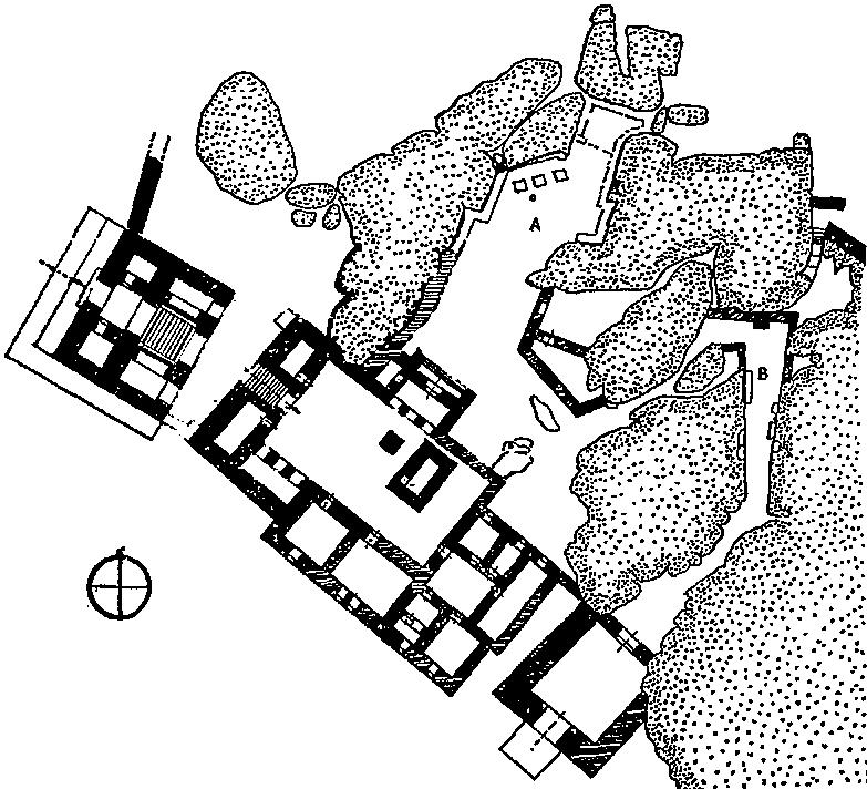 Известны еще четыре храма в южной части города. Три из них, по-видимому, были окружены одной храмовой стеной и стояли на естественных возвышениях над нижним городом. Если не считать отдельных деталей, все они довольно точно воспроизводили план главного храма ( 1). У всех были церемониальные входы, центральные внутренние дворы с колоннадой и внутренними святилищами или алтарями с окнами,