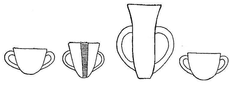 Рис. 9. Сосуды типа депа. Слева направо: Тарсус ЕВ III, Кюльтепе ЕВ III, Троя II, Бейджесултан ХIIIа
