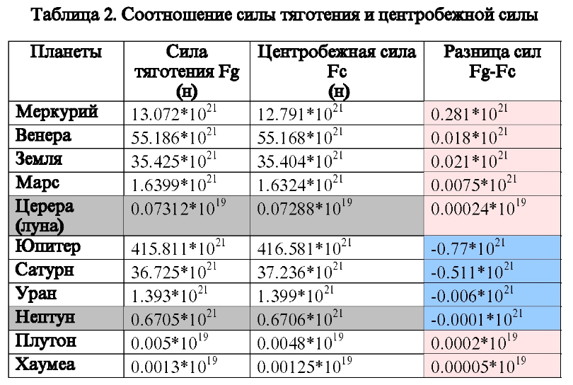В таблице 2 приведены результаты расчета силы тяготения и центробежной силы для 11 планет, в порядке их удаления от Солнца. В третьем столбце дана разница между силой тяготения и центробежной силой. Розовым цветом выделена положительная разница, а синим цветом отрицательная разница.