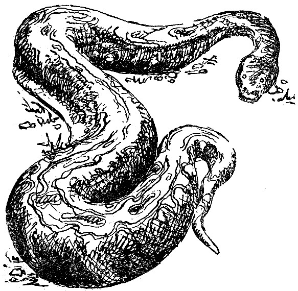 Питон, как и великаны Нового Света боа и анаконда (о них я расскажу дальше), пользуется среди местных жителей дурной славой, которая в общем-то не заслужена. Я знаю только два случая, приведённых голландским зоологом Феликсом Копштейном, когда нападение питона на человека привело к печальному исходу. В одном случае шестиметровый питон сожрал четырнадцатилетнего мальчика, в другом десятиметровый исполин заглотил взрослую женщину. На Нунукане один из рабочих Эрика, отправившись на охоту, еле вырвался из объятий удава. Идя через джунгли по узкой тропе и высматривая следы, он слишком поздно заметил огромного питона, который лежал на суку и подстерегал добычу. Удав молниеносно обвился вокруг него и стиснул. Охотнику удалось освободить одну руку, и он принялся рубить змею парангом, пока не заставил её отпустить его. У него было сломано несколько рёбер, и он долго болел после этой передряги.
