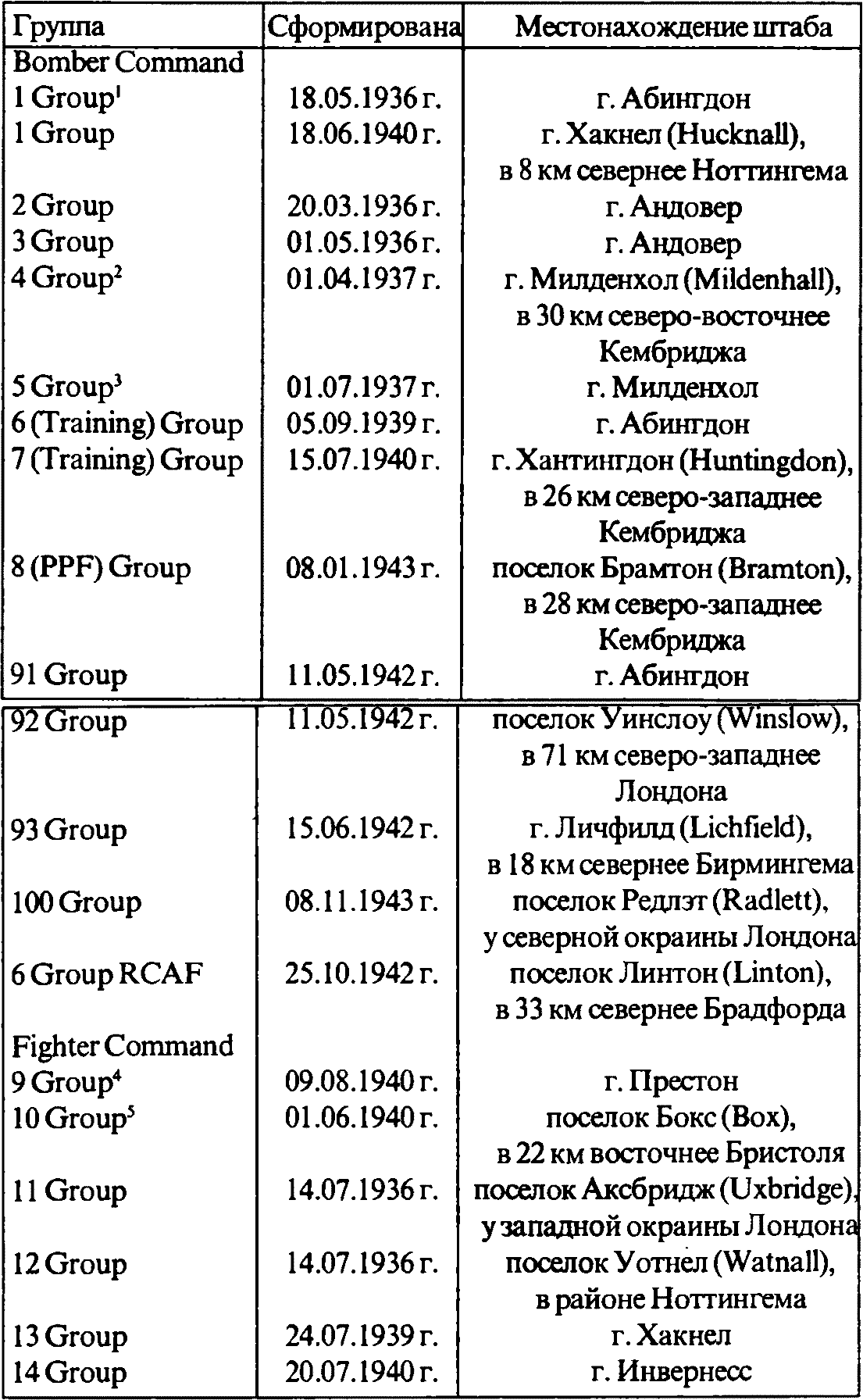 Поскольку авиакрылья, как уже говорилось, были жестко привязаны к конкретным аэродромам, то авиагруппы фактически представляли собой территориальные командования, в которые были сведены однотипные эскадрильи. В отличие от авиакрыльев, авиагруппы не имели собственных названий, а получали порядковые номера. Всего в составе бомбардировочного командования были сформированы тринадцать авиагрупп, в истребительном командовании шесть (см. таблицу 7) и в командовании береговой авиации четыре (15,16,18, и 19 Group).