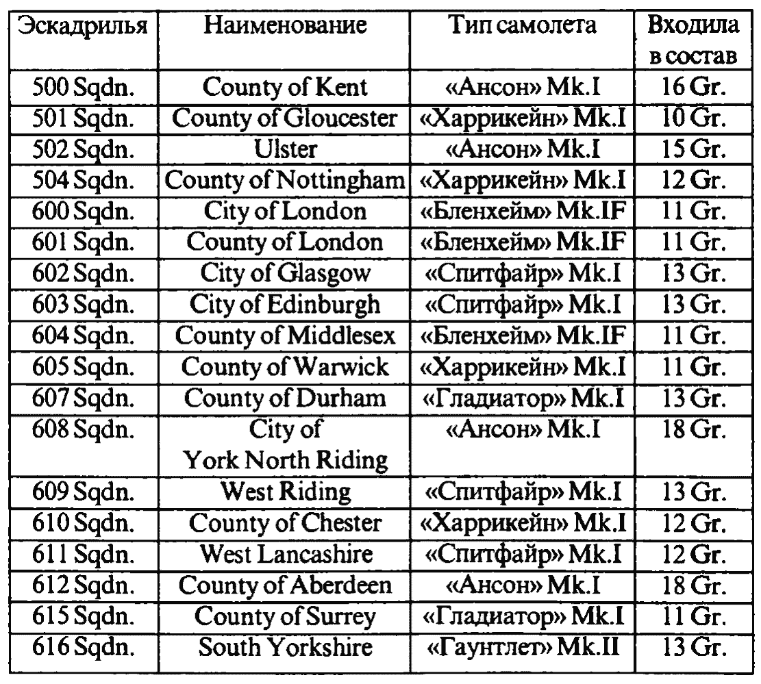 К началу Второй мировой войны в Home Command RAF имелись восемнадцать эскадрилий вспомогательной авиации: четырнадцать в истребительном командовании и четыре в командовании береговой авиации (см. таблицу 8). Несмотря на, казалось бы, более слабую подготовку, по сравнению с летчиками RAF, пилоты вспомогательной авиации отлично проявили себя в ходе войны и многие из них стали асами. В знак признания заслуг вспомогательной авиации король Георг VI16 декабря 1947 г. присвоил ей наименование Королевской вспомогательной авиации (Royal Auxiliary Air Force).
