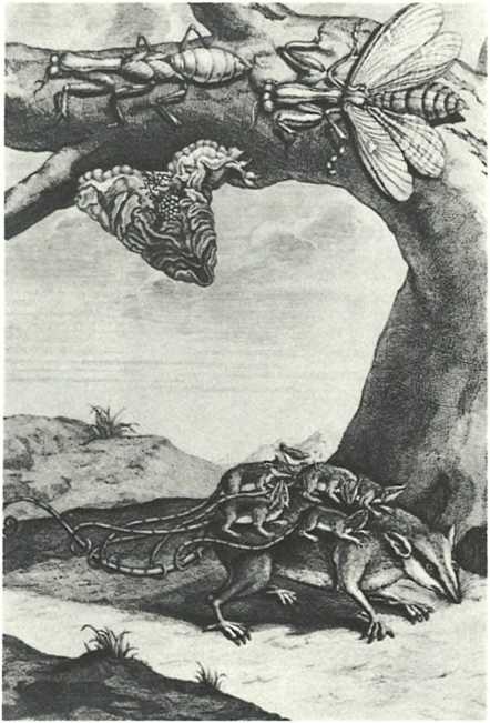 Этот рисунок, принадлежащий художнице-анималистке А. Мериан, стал впоследствии источником многих биологических ошибок, допущенных в отношении опоссума