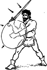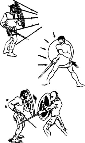На схеме взаимоположение меча и щита, образующих сектор глухой защиты. Прием должен отрабатываться до полного автоматизма. Молниеносное выполнение не должно вызывать затруднений.