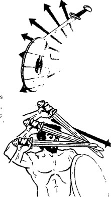 Стрелками обозначены векторы возможных атак, блокируемых отсечкой. Эффективность приема увеличивается смещением в сторону боевой руки противника, навстречу атаке.
