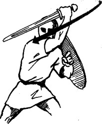 Подоплека медведь. В «миг замысла» противника щит сдвигается вверх и фиксируется в защите торса-головы. Меч перебрасывается вниз к противоположному бедру, образуя сектор защиты, из которого возможно выполнение подъема, обратки, наложения, зацепа щитом.