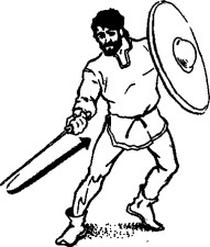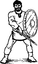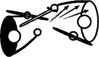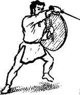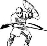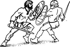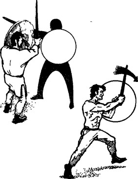Щит бьет в основание меча соперника. На схеме стрелками обозначены векторы возможных ударов, наносимых в зазор между щитами.