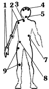 8. Выступ подвздошной (тазовой) кости. Сплошной линией на схеме даны области частого поражения в номинации «щит-меч».