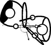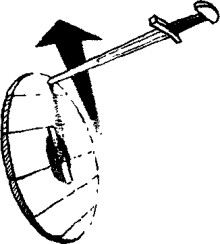 Резким движением разверните свой щит чуть горизонтальней, чтобы грани щитов перекрещивались. Одновременно с этим нанесите удар кромкой своего щита в середину кромки щита противника, заставляя щит сдвинуться и открыть торс. Тут же наносите удар в открывшуюся область. На схеме (вид сверху): пунктирный круг акцентирует область контакта щитов. Стрелки показывают вектор сдвига щитов и направление атаки.