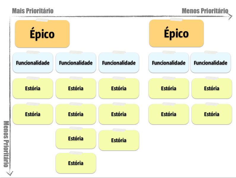representa a prioridade entre diferentes épicos, e diferentes funcionalidades, quanto de baixo para cima que representa a prioridade entre diferentes histórias de usuário.