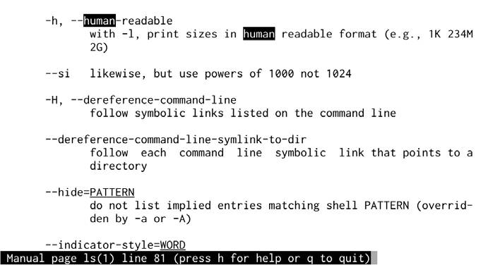 h mostra a ajuda do comando man, veja para mais detalhes;