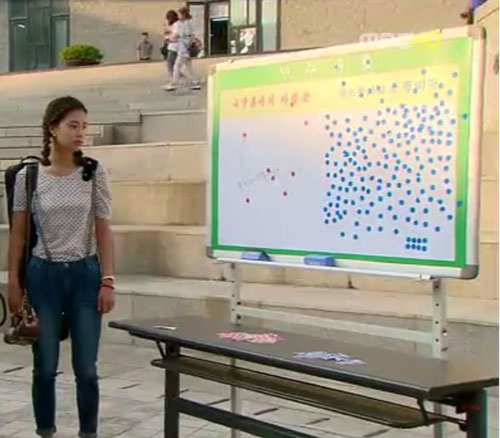 Несколько позже. Батл завершён. У доски для голосования зрителей стоит ЮнМи. Две девушки клеят на правую сторону доски синие кружочки отдают голоса за «Am-kiss». Наклеив, отходят, бросив перед этим насмешливый взгляд на ЮнМи.