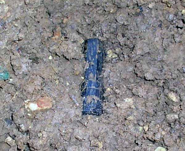 Долгожданная находка. Из глины показался первый медальон невзрачная черная капсула около 5 сантиметров длиной.