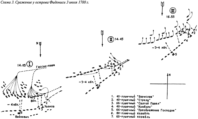 противника, позволяя избежать неприятных случайностей. Однако Хасан-паша воздержался от нападения. Трое суток флоты маневрировали на виду друг у друга, постепенно смещаясь к юго-западу к устью Дуная и удаляясь от Очакова. Наконец, в 8 часов утра 3 июля 1788 года, находясь на виду острова Фидониси, М.И. Войнович приказал повернуть на курс к берегам Крыма и выстроил линию баталии на левом галсе, по-прежнему имея флот Хасан-паши на ветре и на противоположном курсе.