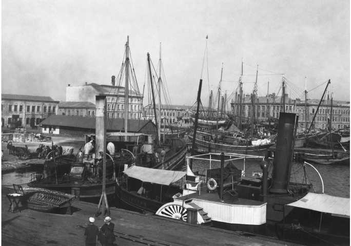 Керченские пристани на Александровской набережной у табачной фабрики Месаксуди, весна 1918 года, во время немецкой оккупации (из собрания библиотеки де Гольера при Южном методистском университете, Техас)