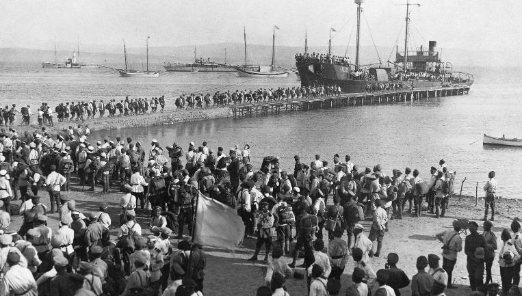 Посадка 1-го эшелона кавалерии в Галлиполи на военный транспорт Эльпидифор 410 при отправке в Сербию, 1921 г. (галлиполийский альбом А. В. Туркула, из собрания Гуверовского института войны, революции и мира при Стэнфордском университете)