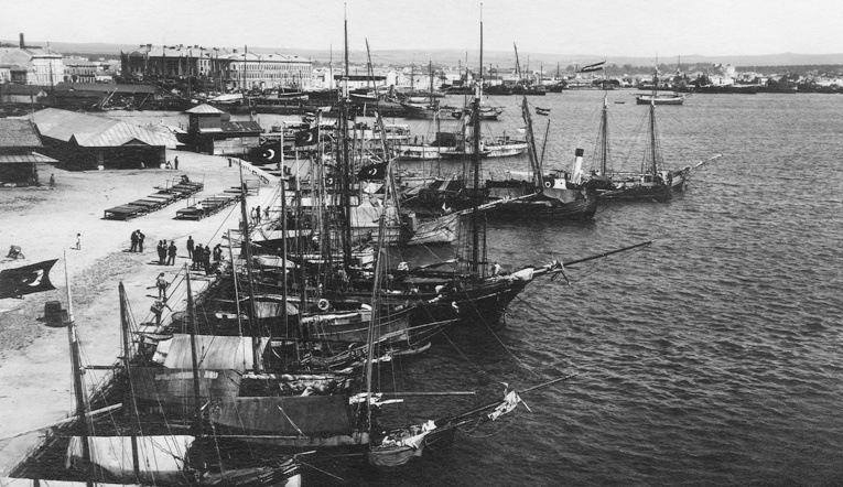 Суда под флагами Турции, союзницы Германии и Австро-Венгрии, у причалов на Таманской площади в Керчи, немецкая оккупация, 1918 год