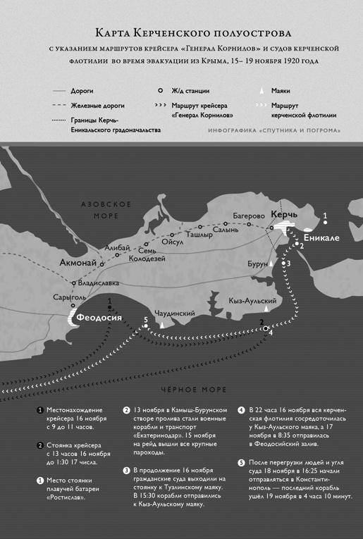 Согласно некоторым данным, количество судов, пришедших из Керчи в Стамбул, превышало 45, включая мелкие, которые не были учтены в официальных сводках, но могли перевезти по нескольку десятков человек. Например, в весьма неточном донесении красной разведки присутствуют несколько парусно-моторных деревянных судов.