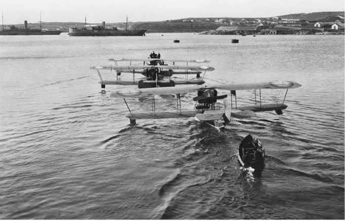 Три русских гидросамолёта M-9 буксируются в гавань Севастополя, весна 1918 года, во время немецкой оккупации (из собрания библиотеки де Гольера при Южном методистском университете, Техас)