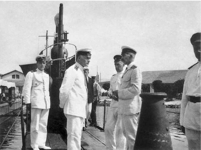 На подводной лодке «Тюлень» в Бизерте (Тунис), июль 1921 года. Слева направо на переднем плане: флаг-офицер старший лейтенант Г. В. Чехов, вице-адмирал М. А. Кедров, контр-адмирал М. А. Беренс, контр-адмирал А. И. Тихменев