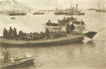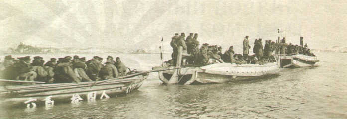 Шесть переполненных японскими солдатами и грузом лодок направляются к берегу Чемульпо.