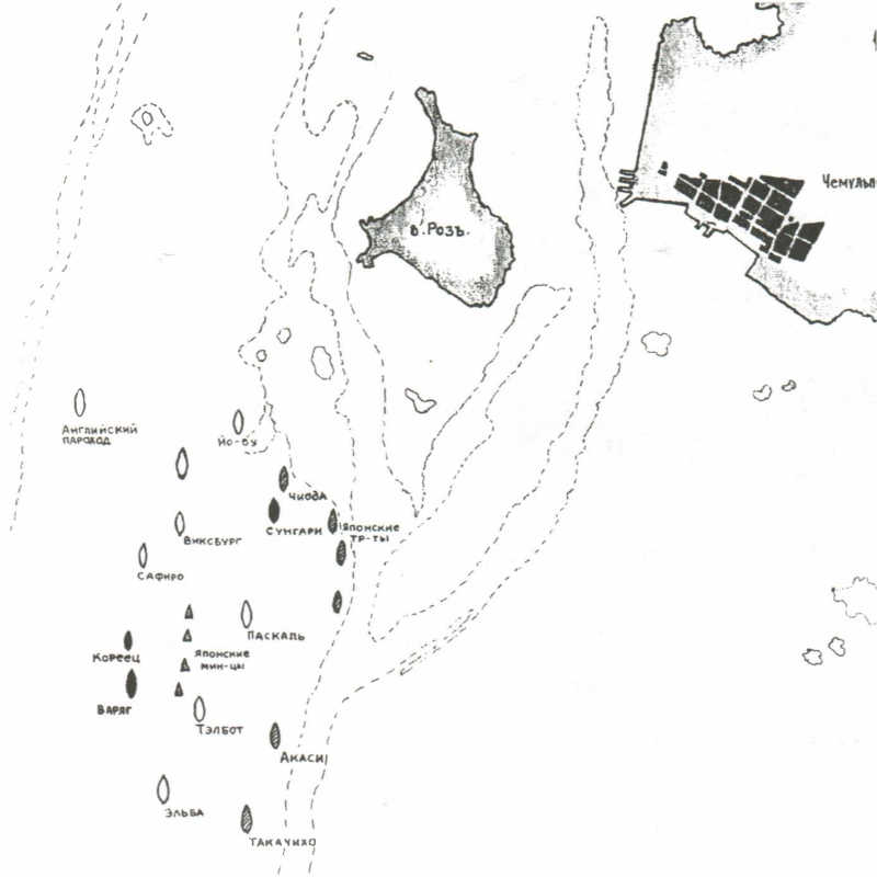 Офицеры единодушно решили в случае неудачи прорыва взорвать крейсер и ни в коем случае не отдавать его в руки неприятеля. Вскоре командиру доложили, что японский крейсер «Чиода» снялся с якоря и вышел из гавани. Руднев приказал построить команду на шканцах. Вкратце изложив ситуацию, командир призвал экипаж не посрамить честь Андреевского флага и добавил: