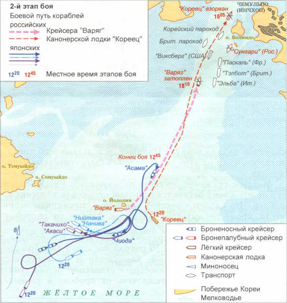 наблюдал попадание в русский корабль. Последние выстрелы, сделанные из носового барбета «Асамы», вызвали на «Варяге» пожар в кормовой части. Командир «Асамы» имел намерение идти на таран русского крейсера. Однако последний находился уже в нейтральной зоне, среди иностранных судов. Поэтому два японских крейсера были вынуждены вернуться к эскадре. В 13:40 весь морской отряд контр-адмирала Уриу выстроился к западу от входа в гавань.