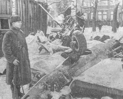 Узнали подробности и об экипаже бомбардировщика. Когда самолет начал разваливаться, немцы раскрыли парашюты и, освещенные прожекторами, опустились на улицу Маяковского. Ну а тут что было! Хорошо, что бойцы истребительного батальона сразу окружили гитлеровцев и до прихода милиции спрятали их в булочную, а то никакая сила не остановила бы женшин