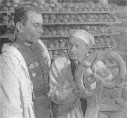 Он ведет летчика вдоль несметного числа полок, на которых чего-чего только нет: батоны сахарные и простые, халы, плетенки, подковки, калачи, кольца, плюшки, пряники медовые и мятные, торты, пирожные и, конечно же, выборгские крендели, настоящей, сдобной выпечки. Сотня с лишним названий!
