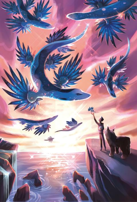 Тимур замер: по небу летела стая огромных голубых драконов. Медленно взмахивая гигантскими крыльями-плавниками, они гордо плыли по воздуху, касаясь облаков. Их вытянутые тела двигались плавно и грациозно, вспыхивая синими искрами под яркими лучами солнца.