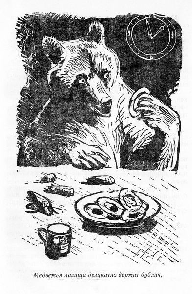 Машка с аппетитом хрустит морковью. Обронив на пол зеленый огрызок, берет из миски бублик. Медвежья лапища с кривыми железными когтями деликатно держит бублик. Рот приоткрывается чуть-чуть, зубы откусывают понемножку. Зверь ведет себя за столом безукоризненно. Ест без жадности. Не торопясь. Разглядывая бублик своими медвежьими глазками. Хозяин сидит возле Машки и тоже ест бублик. Мы с шофером стоим в дверях. Мы уже освоились, осмелели. Начинаем обмениваться впечатлениями