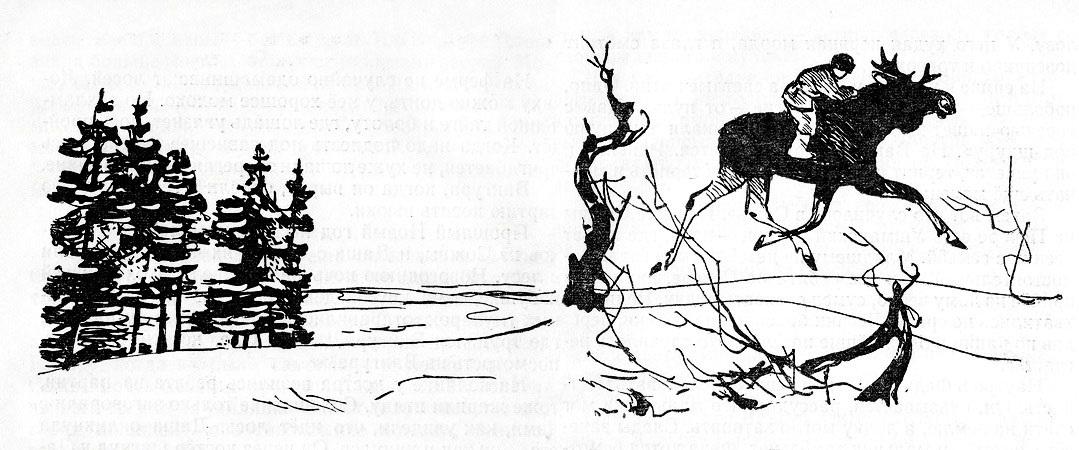 Как он вскарабкался на спину Вангура и как удержался не понимаю. Люди, которые объезжают лосей, рассказывают, что даже в седле, с уздечкой на лосе удержаться трудно. Лось нагибается сорвать листок, и как ни хватайся летишь через его голову с клочком шерсти в кулаке.