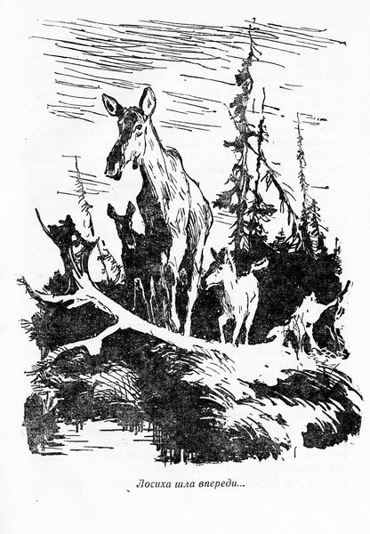 С дороги свернули в чащу. Лосиха, раздвигая кусты, шла впереди, беспокойно оглядываясь. Она знала и не боялась лошадей, понимала и то, что Латуня еще маленький, но зачем он идет за ними, этого она понять не могла. Что, если он обидит ее теленка? Она отлично видела, как низко стоящий па ногах Латуня, толстый и неуклюжий по сравнению с ее длинноногим, поджарым теленком, с трудом продирается сквозь кустарник, и все ускоряла ход, надеясь, что он отстанет.