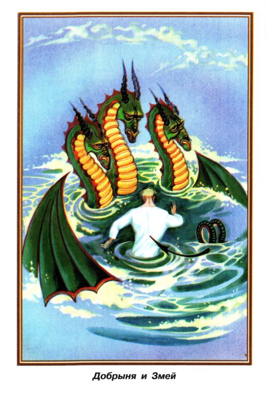 А поганый Змеинище-Горынище учуял Добрыню за полпоприща, налетел, стал огнём палить да биться-ратиться. Бьются они час и другой. Изнурился борзый конь, спотыкаться стал, и у Добрыни правая рука умахалась, в глазах свет померк. Тут и вспомнил богатырь материнский наказ. Сам утёрся расшитым платком белополотняным и коня утёр. Стал его верный конь поскакивать в три раза резвее прежнего. И у Добрыни вся усталость прошла, его сила утроилась. Улучил он время, махнул над Змеем плёткой семишелковой, и сила у Змея истощилася: приник-припал он к сырой земле.